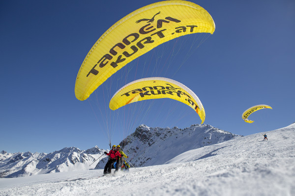 Because your paraglider tandem flight starts directly from the ski slope. Equipped with skis, we meet right at the top station. Together we drive down the slope and swing into the air. You can pass the populated slopes and snow-covered slopes at a pace of 35 to 40 km/h. And on landing, let your ski buddies cheer you at the valley station.