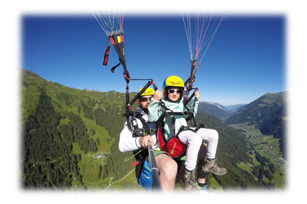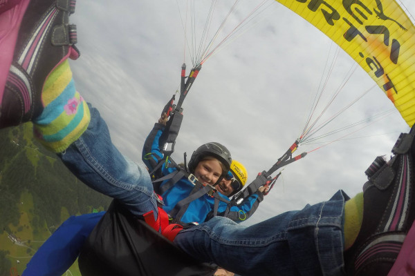 Then come to us and book a paragliding flight. With us, almost everyone can experience the wonderful experience of a paragliding flight. Our pilot will sit directly behind the young pilots during the tandem flight and will take over all the controls.